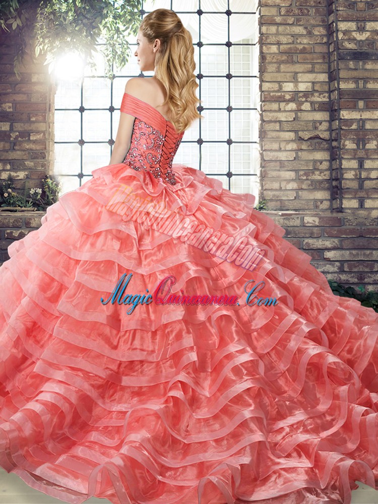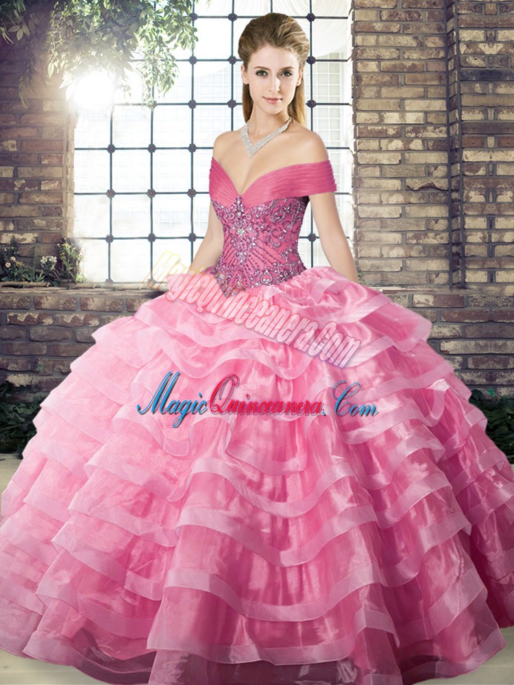 Suitable Rose Pink Lace Up Off The Shoulder Beading and Ruffled Layers Quince Ball Gowns Organza Sleeveless Brush Train