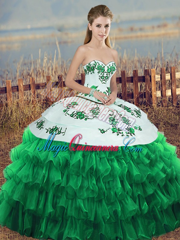 Suitable Sleeveless Organza Floor Length Lace Up Quinceanera Gowns in Green with Embroidery and Ruffled Layers and Bowknot