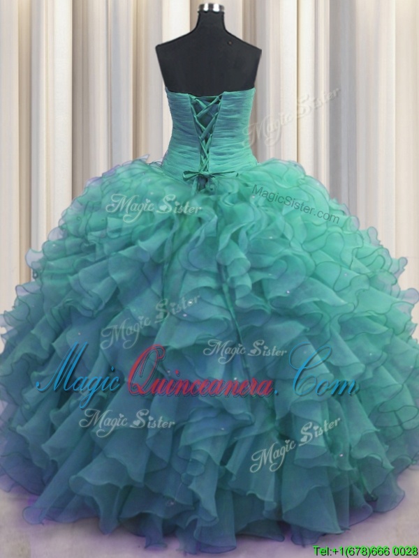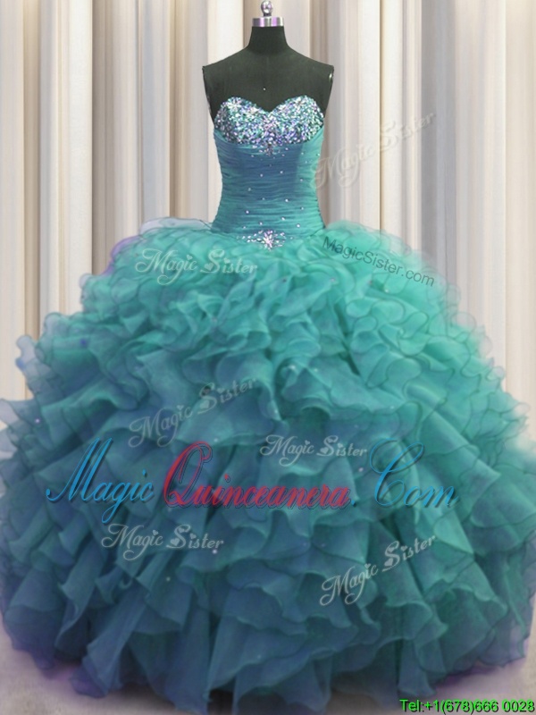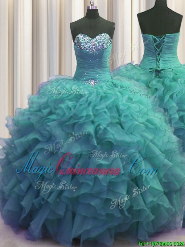 Sumptuous Beaded Bust Turquoise Lace Up Sweetheart Beading and Ruffles Sweet 16 Dress Organza Sleeveless