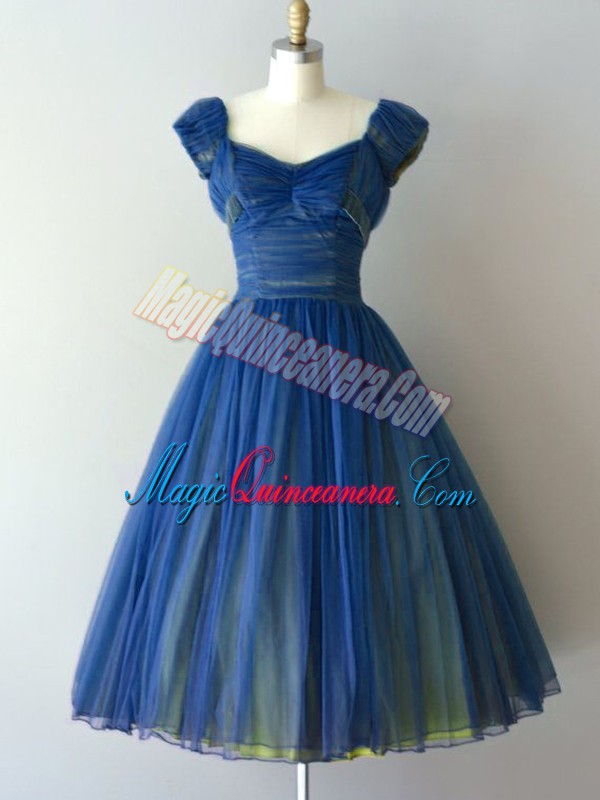 Sumptuous Blue Cap Sleeves Chiffon and Tulle Lace Up Dama Dress for Quinceanera for Prom and Party and Military Ball and Sweet 16