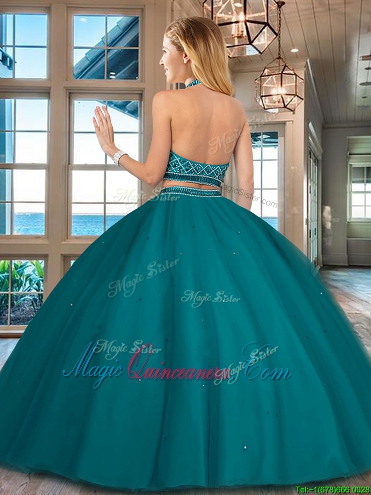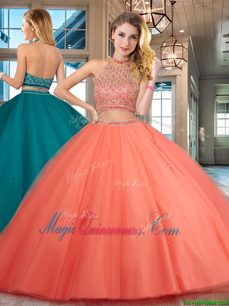 Sumptuous Halter Top Sleeveless Tulle Floor Length Backless Sweet 16 Dresses in Orange Red for with Beading - Magic Quinceanera