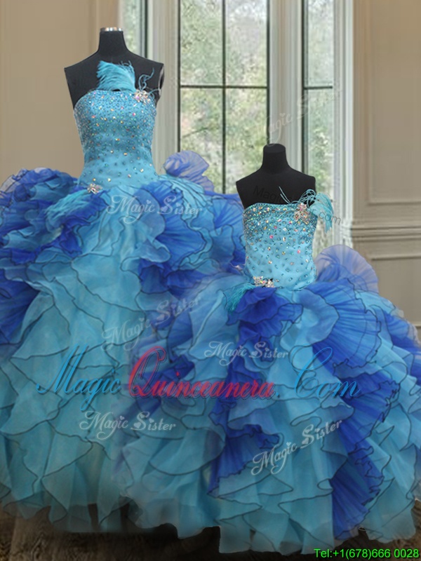 Sumptuous Organza Strapless Sleeveless Lace Up Beading and Ruffles Quinceanera Gown in Blue