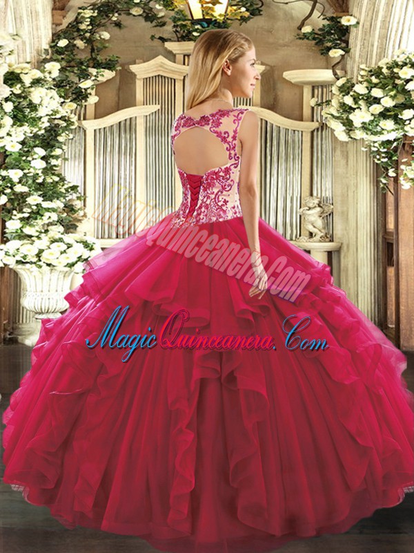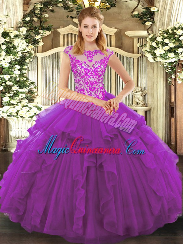 Sumptuous Purple Lace Up Scoop Beading and Ruffles Quinceanera Dresses Organza Cap Sleeves