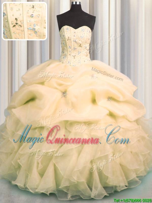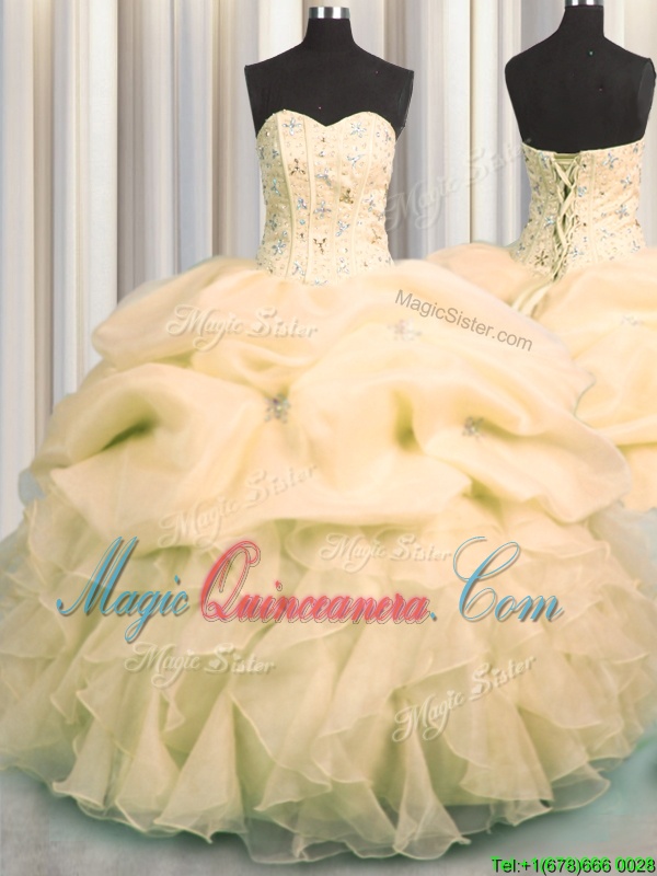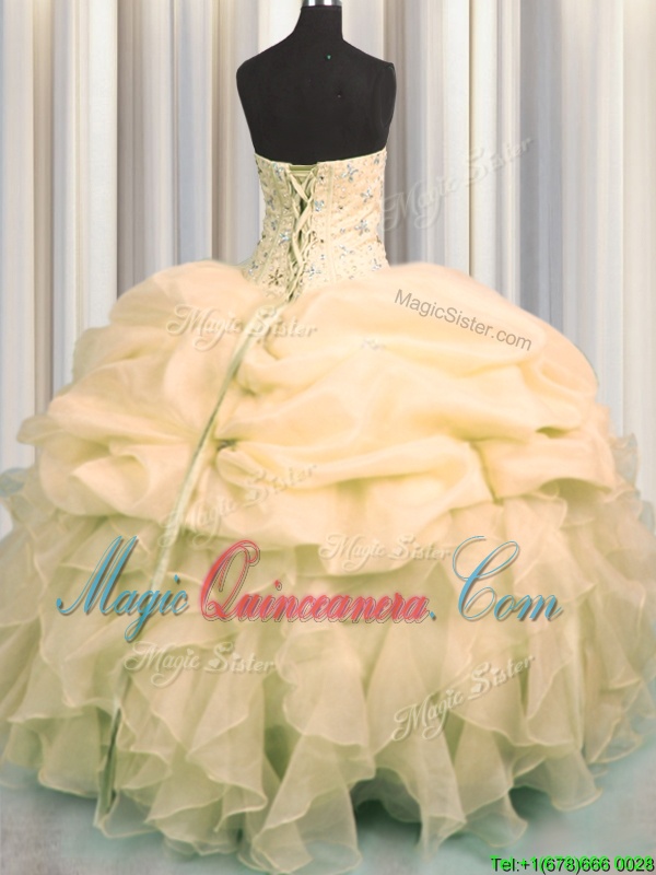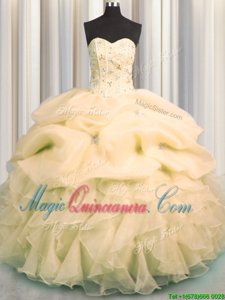 Sumptuous Visible Boning Organza Sleeveless Floor Length Quinceanera Gown and Beading and Ruffles and Pick Ups