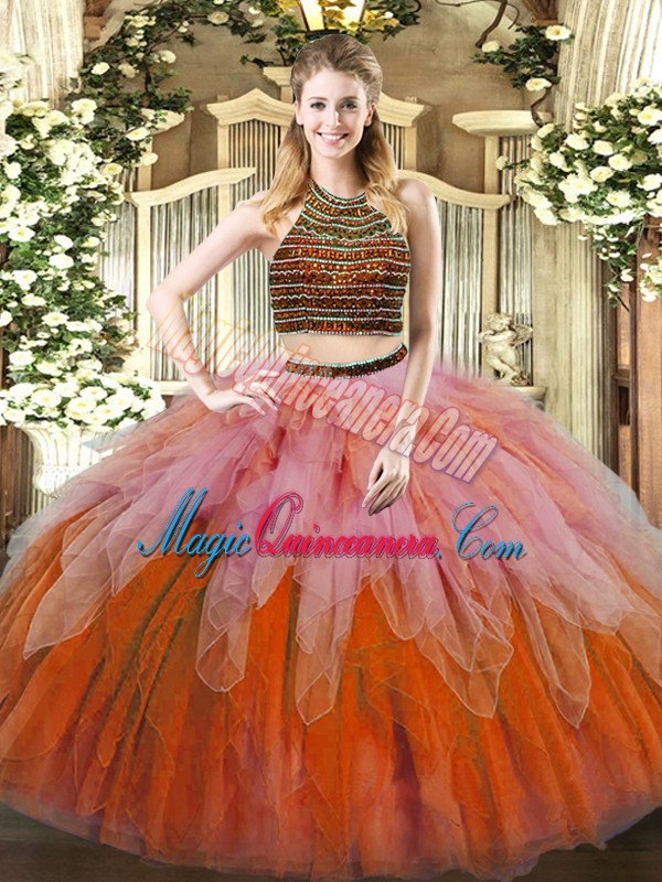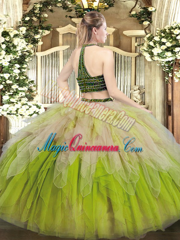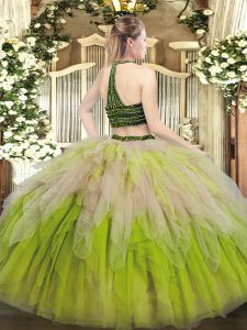 Super Multi-color Halter Top Neckline Beading and Ruffles Quinceanera Dress Sleeveless Lace Up