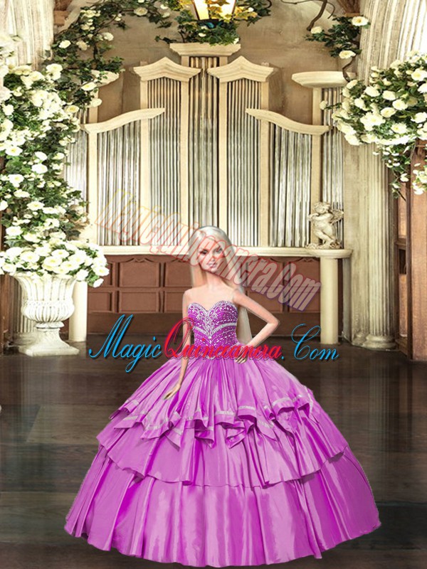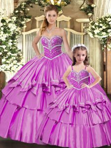 Super Sleeveless Floor Length Beading and Ruffled Layers Lace Up Sweet 16 Quinceanera Dress with Lilac