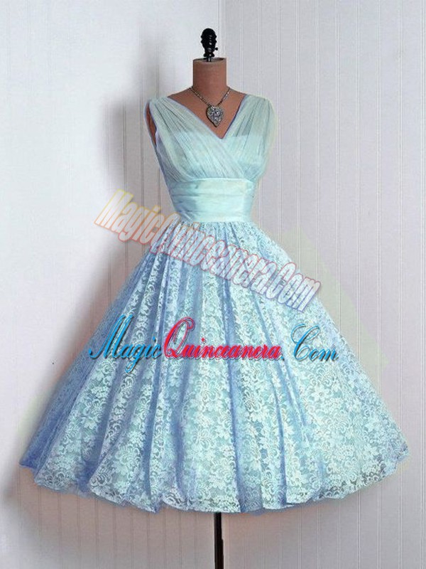 Super Sleeveless Lace Mini Length Lace Up Court Dresses for Sweet 16 in Baby Blue with Lace