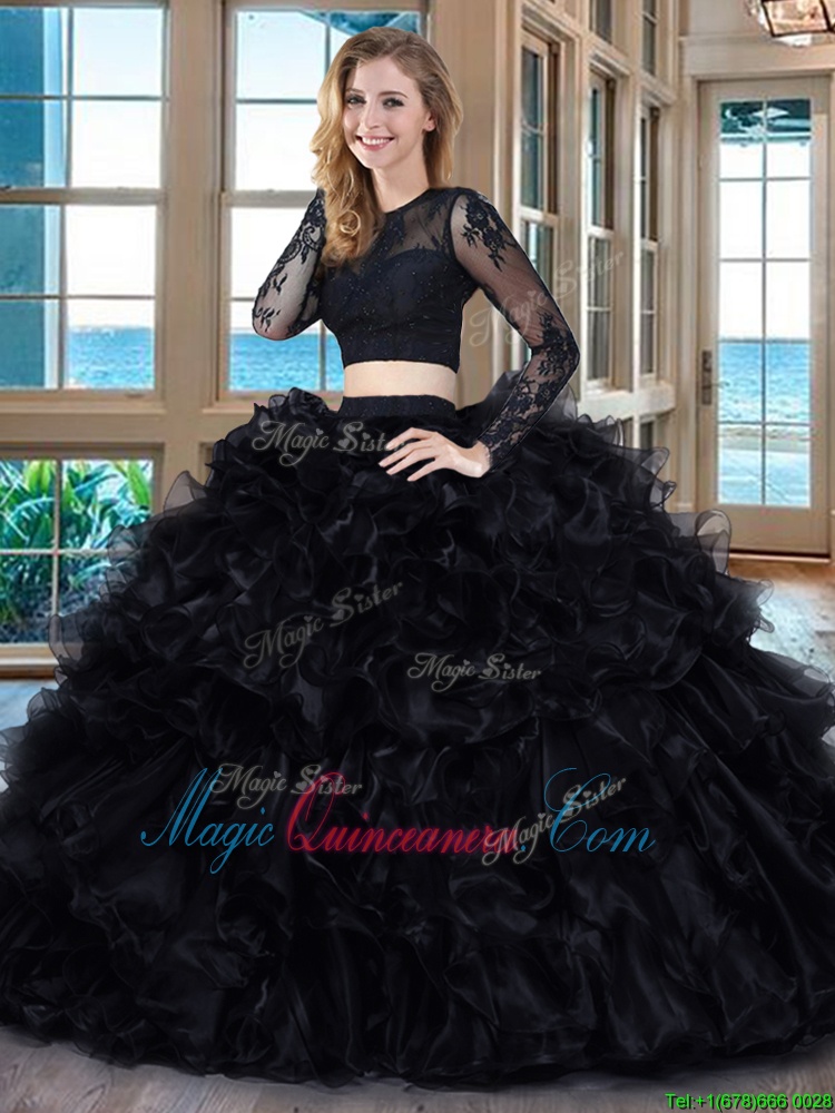 Super Two Pieces Ball Gown Prom Dress Black Scoop Organza Long Sleeves Floor Length Backless