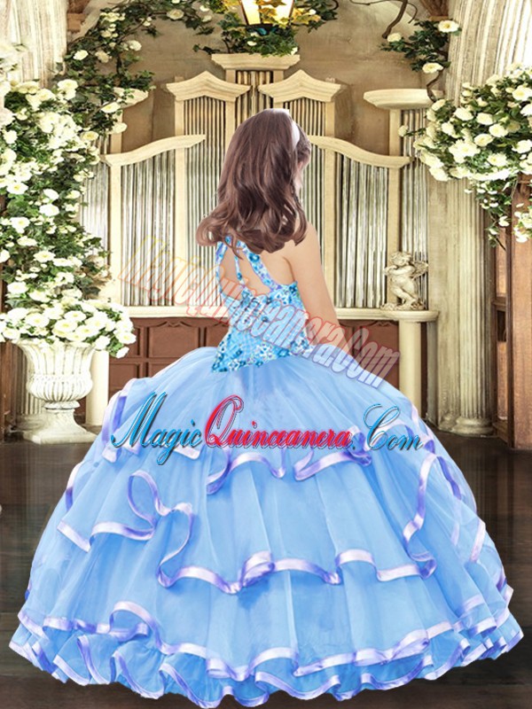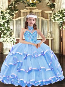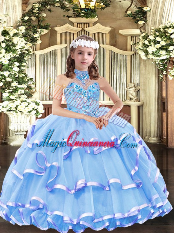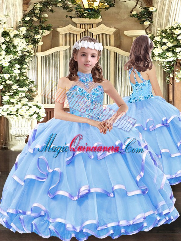 Superior Organza High-neck Sleeveless Lace Up Appliques and Ruffled Layers Little Girls Pageant Dress Wholesale in Baby Blue