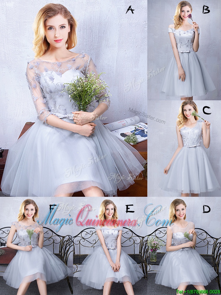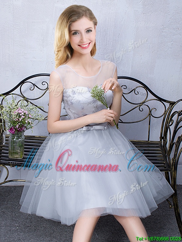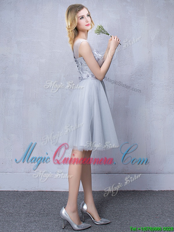 Superior Scoop Grey Sleeveless Lace and Appliques and Belt Knee Length Dama Dress for Quinceanera - Magic Quinceanera