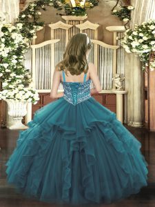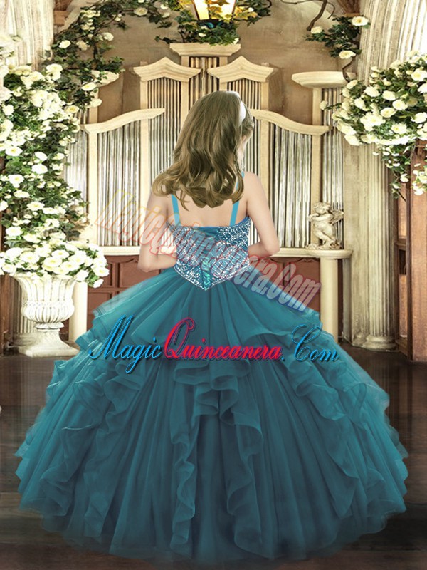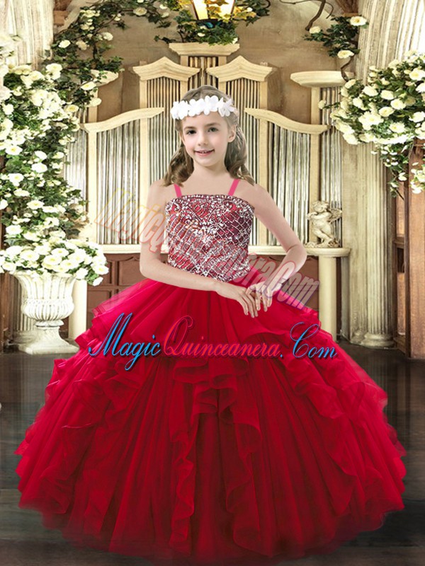 Superior Straps Sleeveless Kids Formal Wear Floor Length Beading and Ruffles Wine Red Organza
