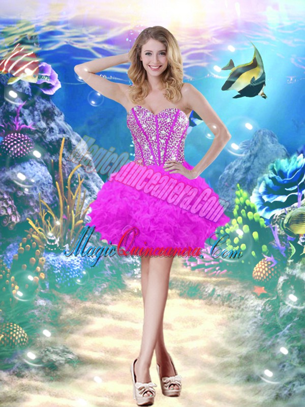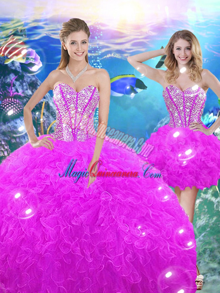 Sweet Sleeveless Floor Length Beading and Ruffles Lace Up Quinceanera Gowns with Fuchsia