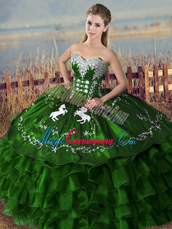 Sweetheart Sleeveless 15th Birthday Dress Floor Length Embroidery and Ruffles Green Satin and Organza