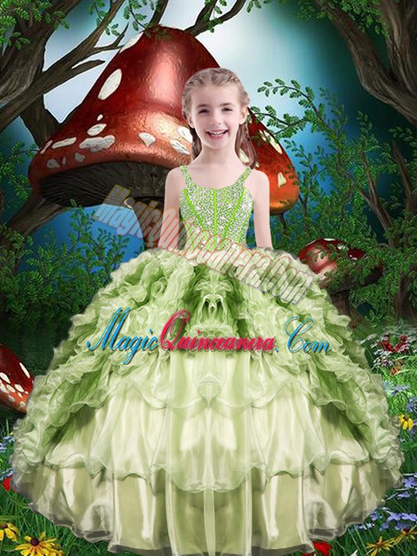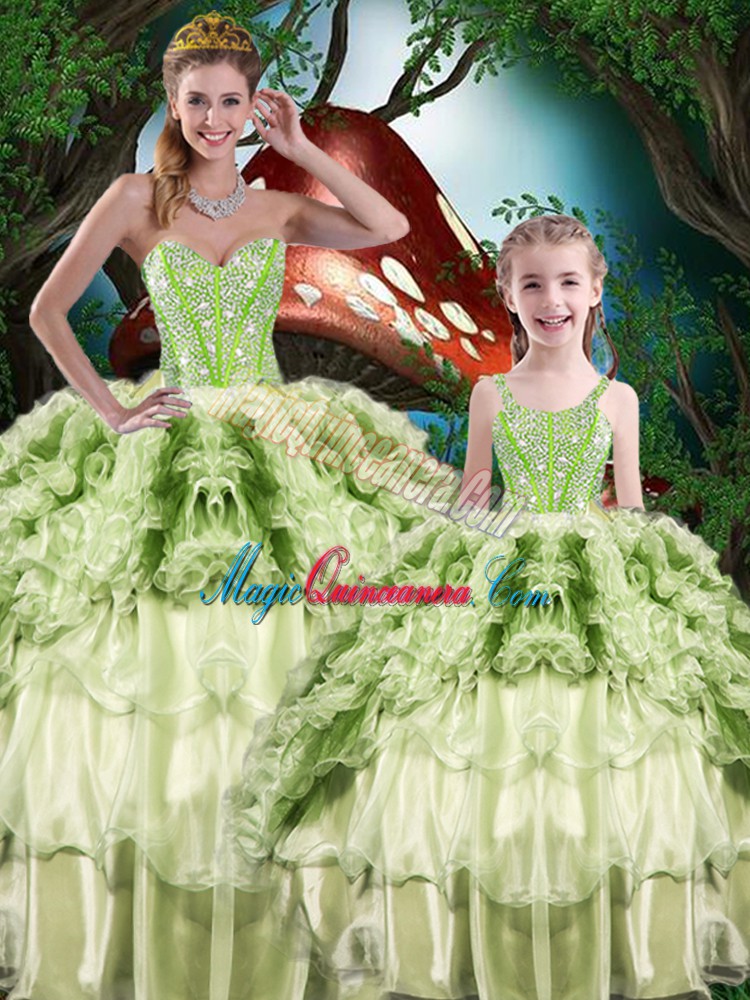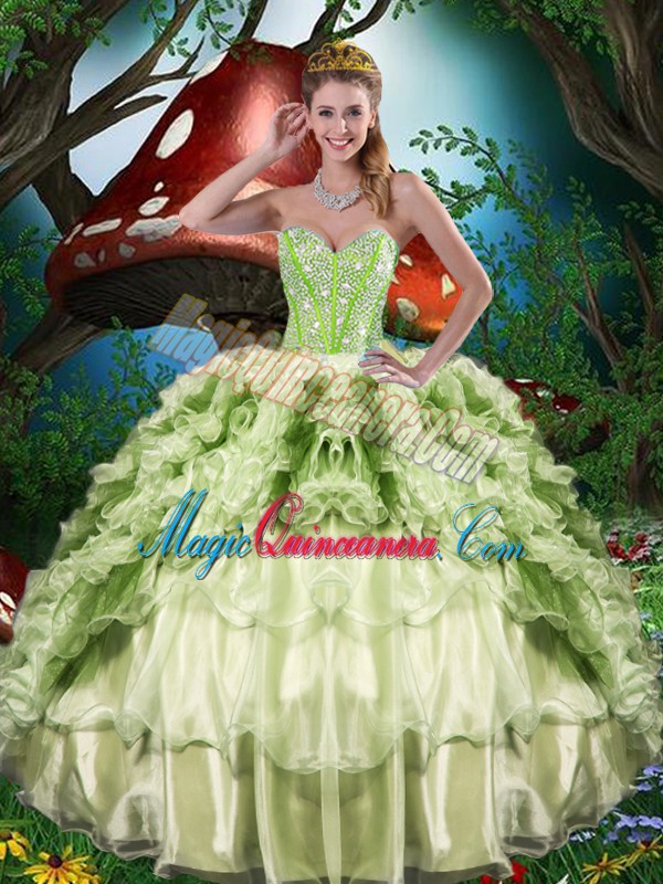 Sweetheart Sleeveless Ball Gown Prom Dress Floor Length Beading and Ruffles and Ruffled Layers Yellow Green Organza