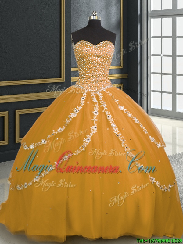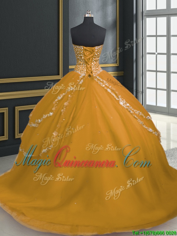 Sweetheart Sleeveless Brush Train Lace Up Sweet 16 Dresses Gold Tulle