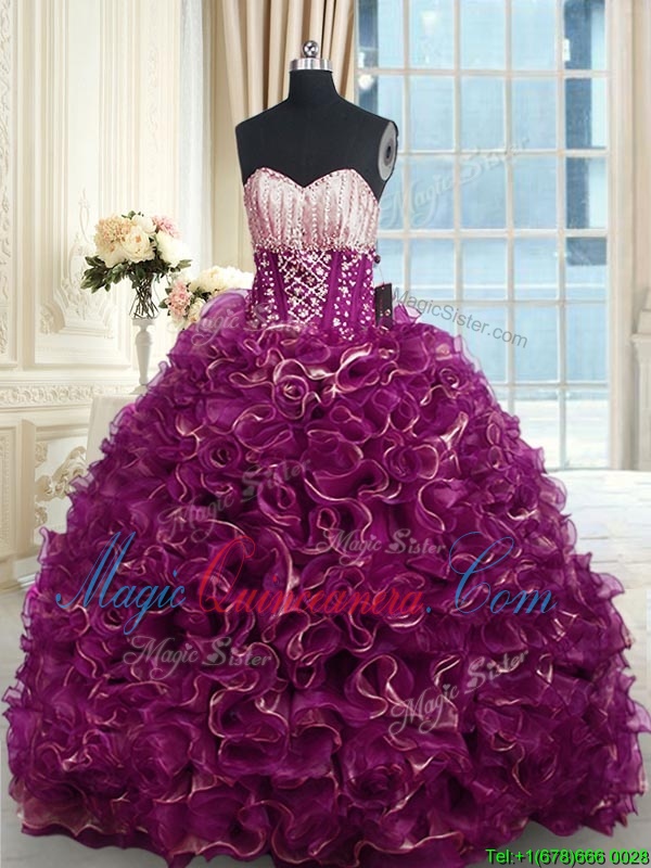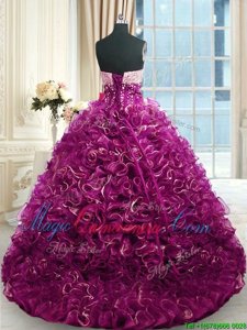 Sweetheart Sleeveless Quince Ball Gowns With Brush Train Beading and Ruffles Fuchsia Organza