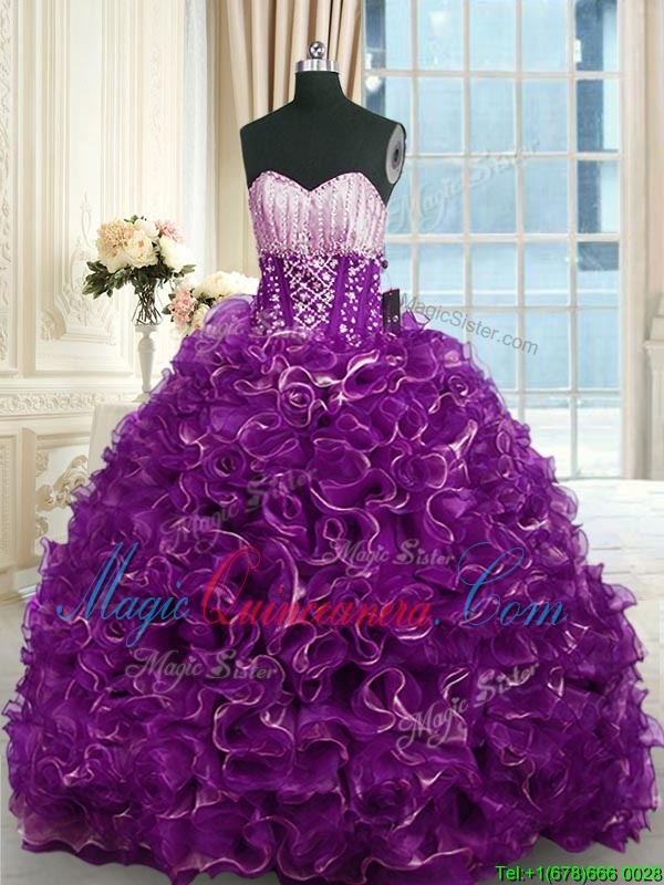 Sweetheart Sleeveless Quinceanera Dress With Brush Train Beading and Ruffles Purple Organza