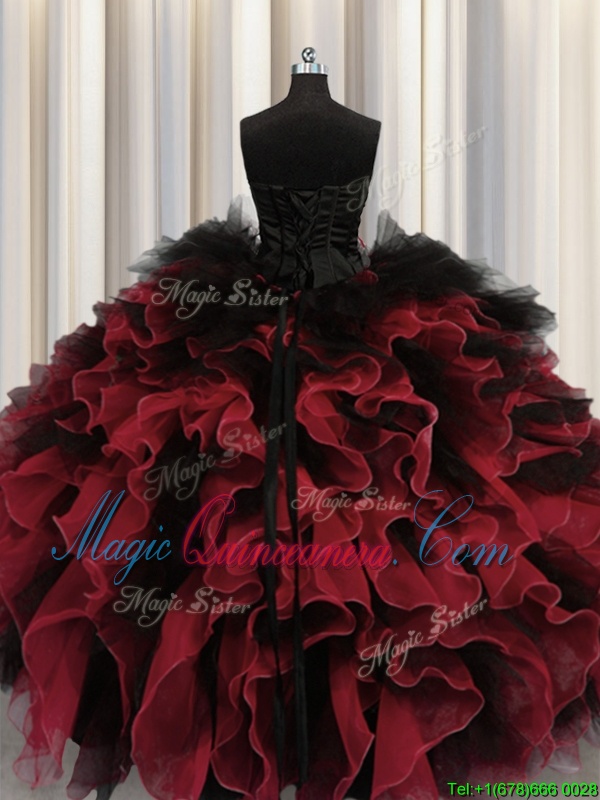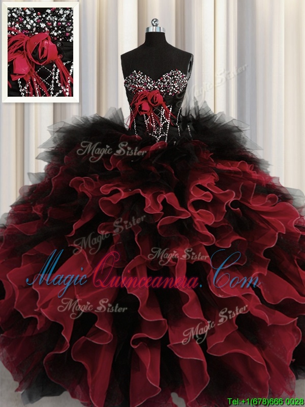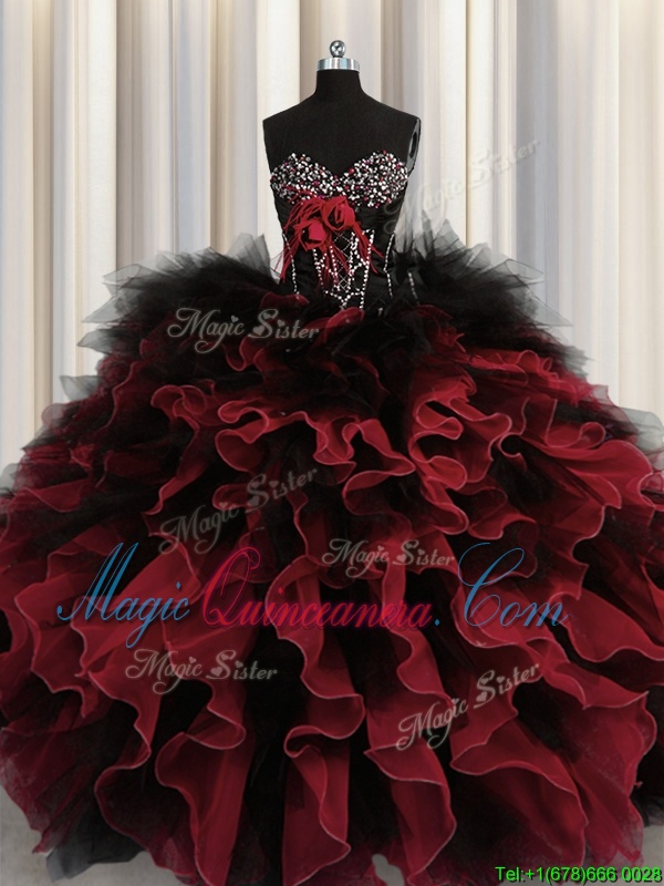 Sweetheart Sleeveless Quinceanera Gown Floor Length Beading and Ruffles Red And Black Organza and Tulle