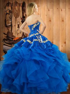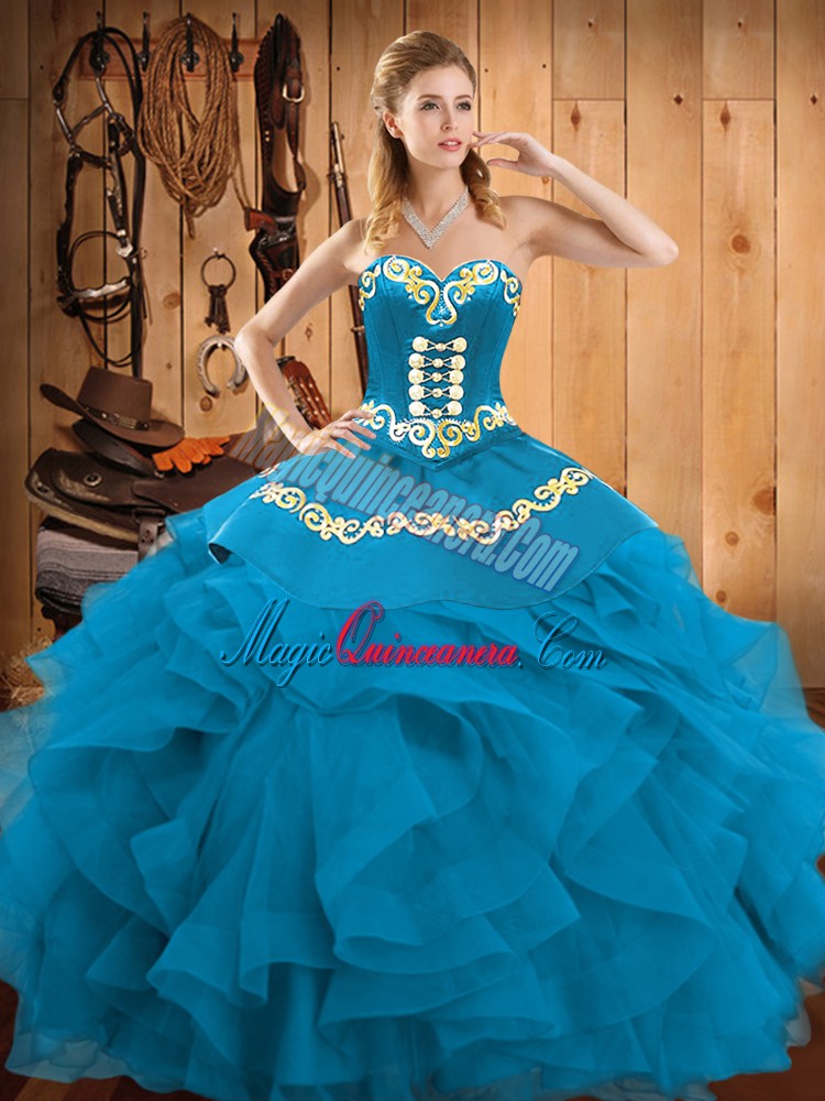 Sweetheart Sleeveless Satin and Organza 15th Birthday Dress Embroidery and Ruffles Lace Up
