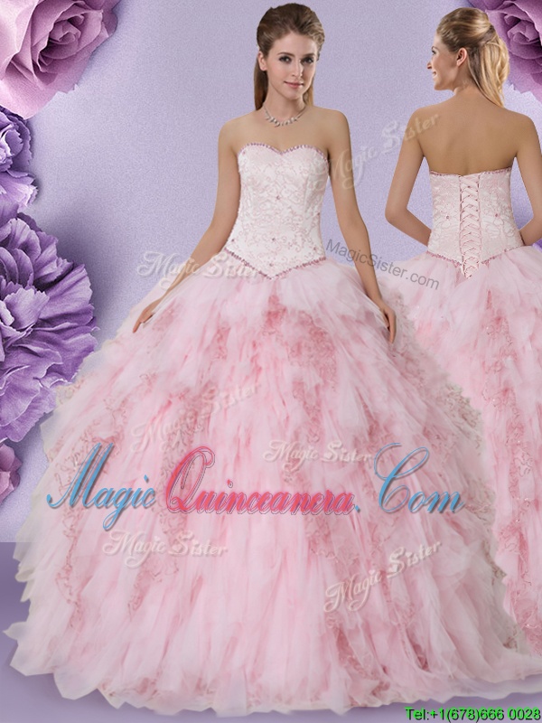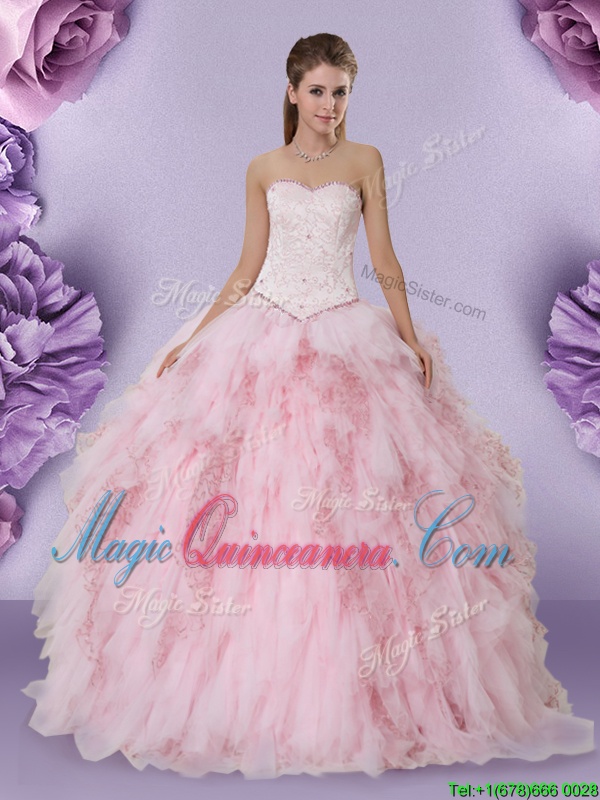 Sweetheart Sleeveless Sweet 16 Dress Floor Length Beading and Lace and Ruffles Baby Pink Tulle