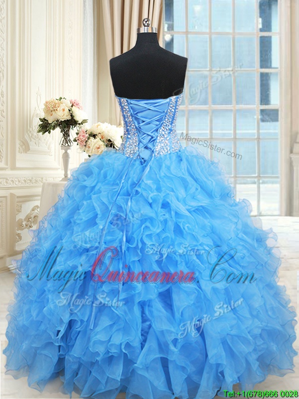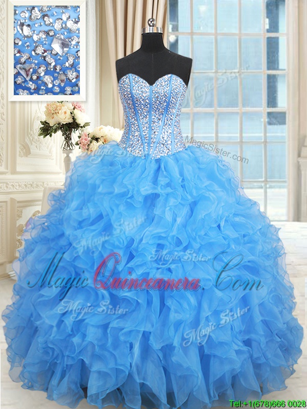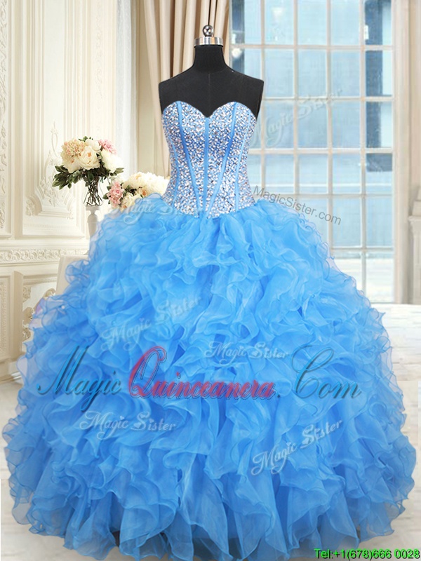 Sweetheart Sleeveless Sweet 16 Dress Floor Length Beading and Ruffles and Ruffled Layers Baby Blue Satin and Organza