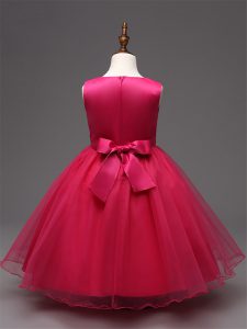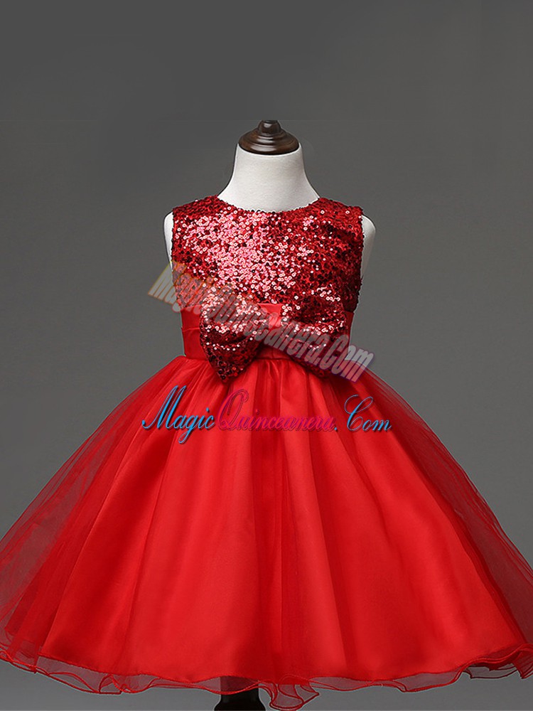 Tea Length Zipper Pageant Dress for Teens Red for Wedding Party with Sequins and Bowknot