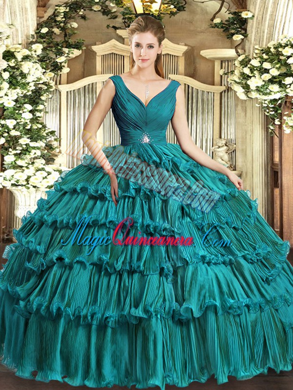 , Teal Backless V-neck Beading and Ruffled Layers Sweet 16 Dress Organza Sleeveless