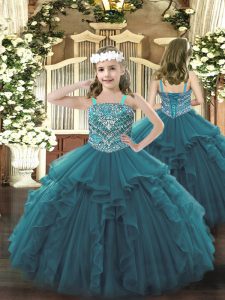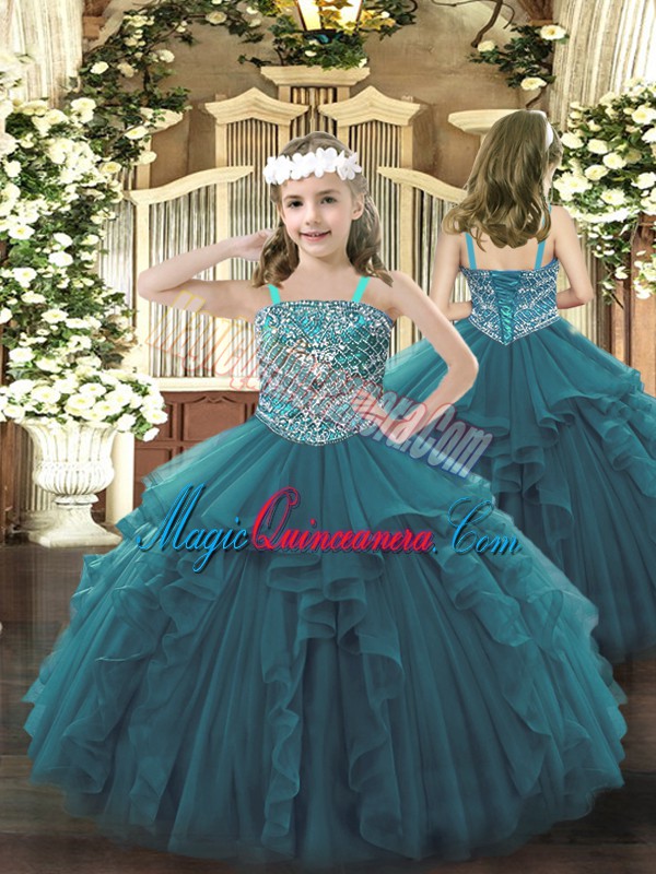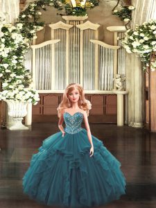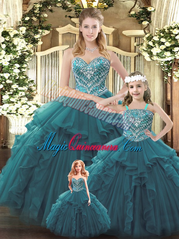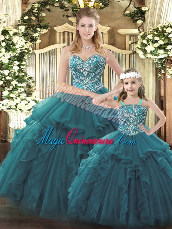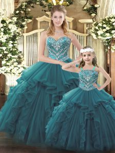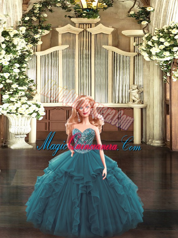 Teal Ball Gowns Sweetheart Sleeveless Organza Floor Length Lace Up Beading and Ruffles 15 Quinceanera Dress