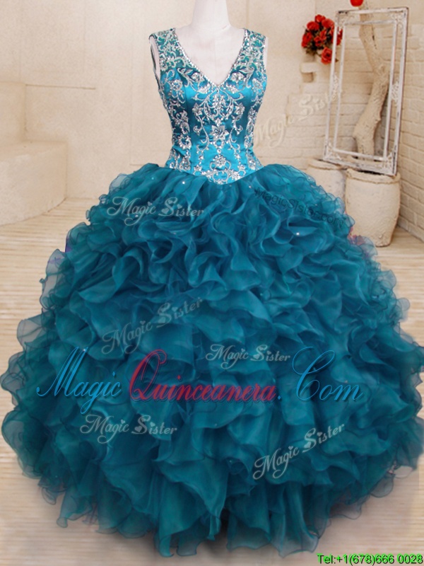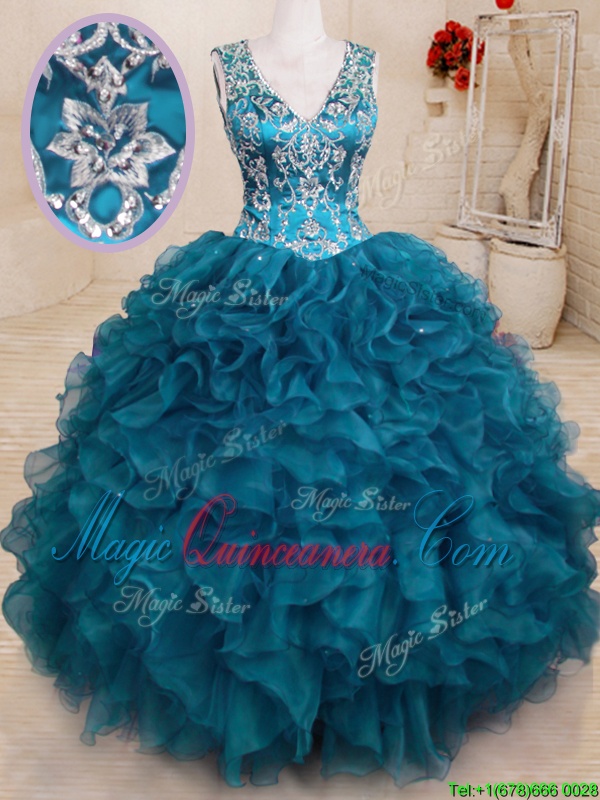 Teal Ball Gowns V-neck Sleeveless Organza Floor Length Backless Beading and Embroidery and Ruffles 15th Birthday Dress