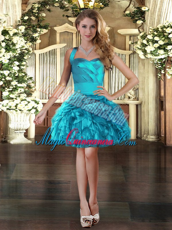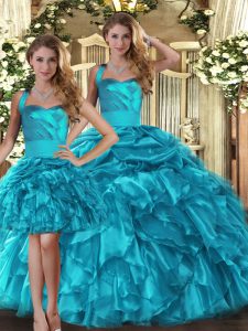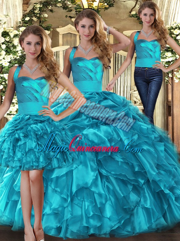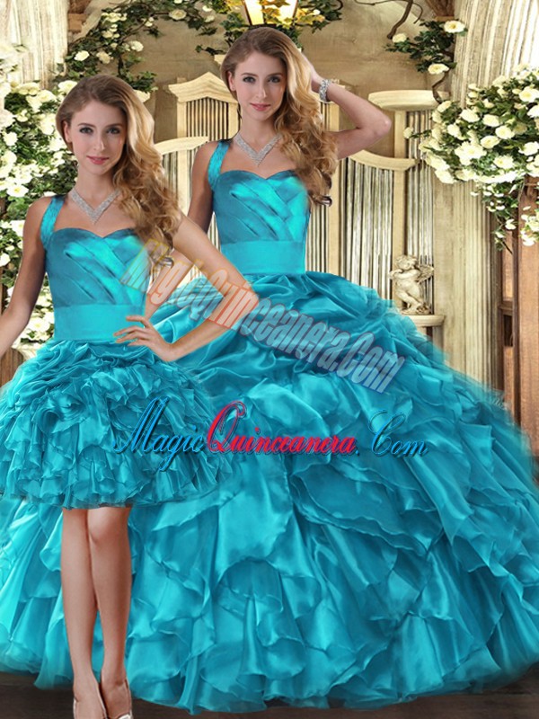 Teal Organza Lace Up Halter Top Sleeveless Floor Length Vestidos de Quinceanera Ruffles and Pick Ups