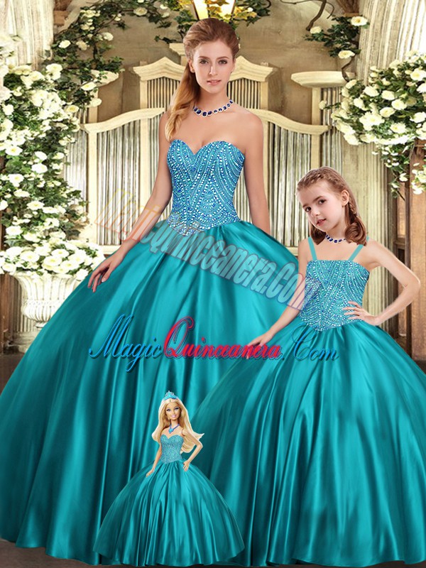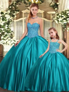 Teal Organza Lace Up Sweetheart Sleeveless Floor Length Quinceanera Dress Beading