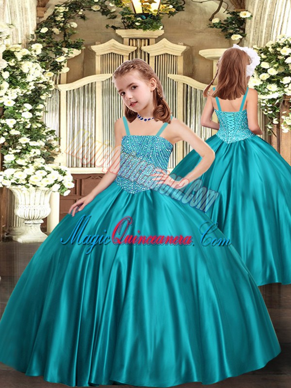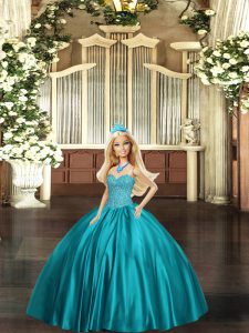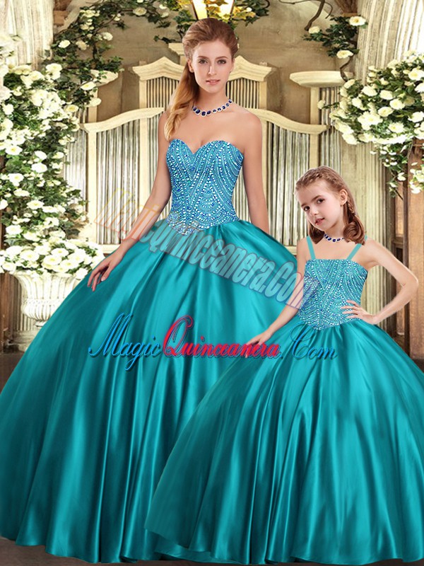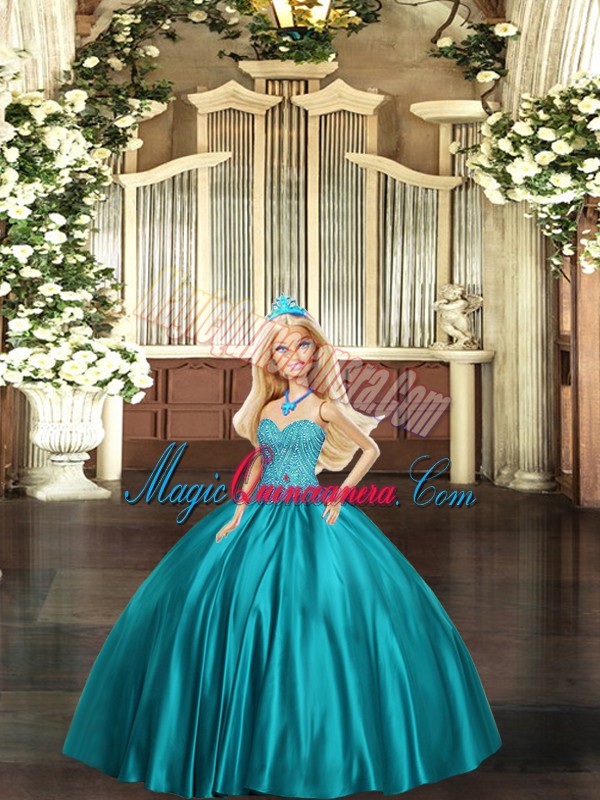 , Teal Organza Lace Up Sweetheart Sleeveless Floor Length Quinceanera Dress Beading