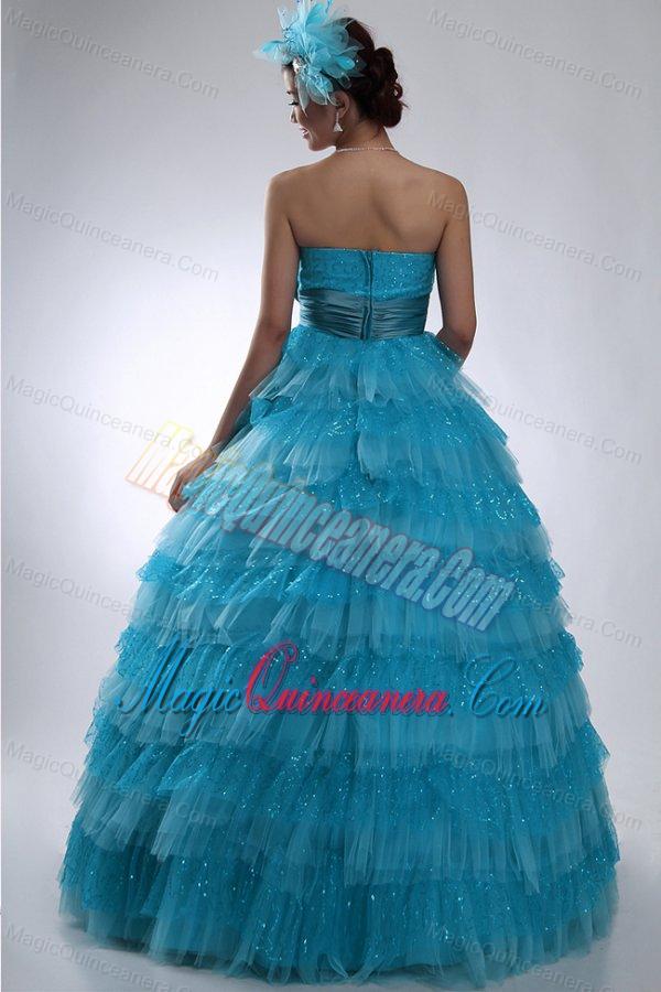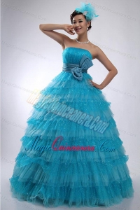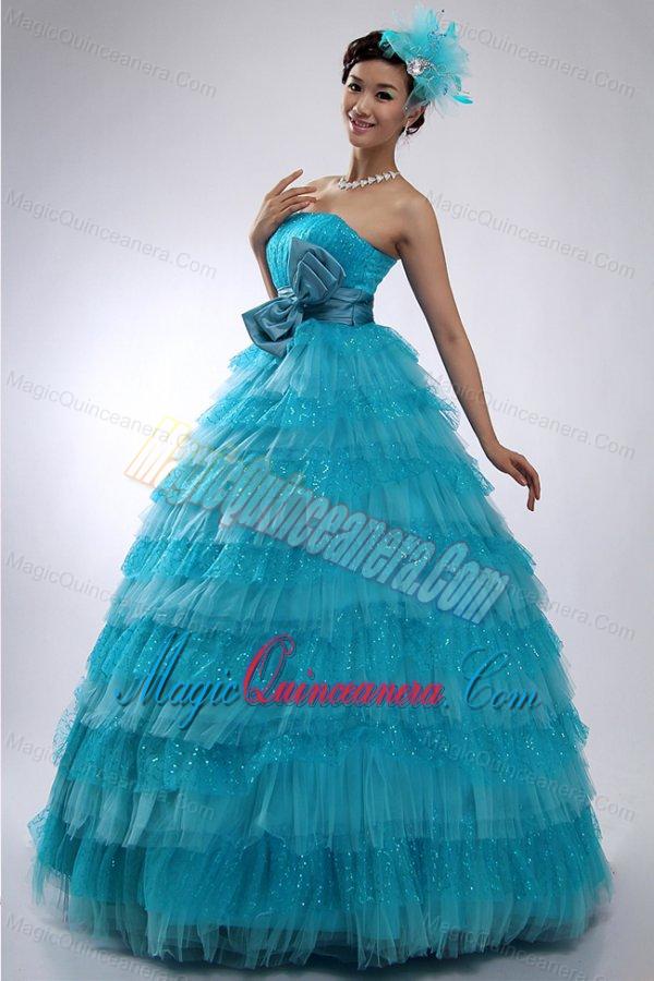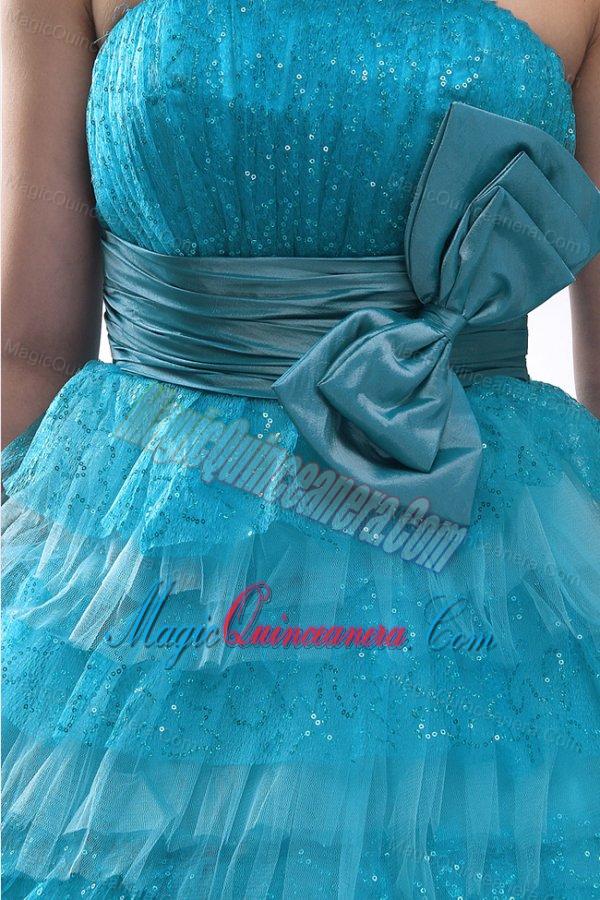 organza dresses for a quince 2015 summer, Teal Strapless Tulle and Sequins Long Quinceanera Dress with Bowknot