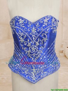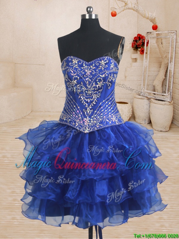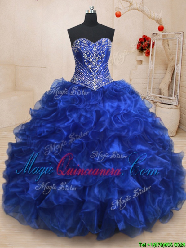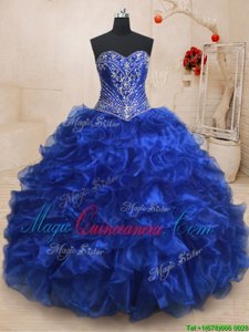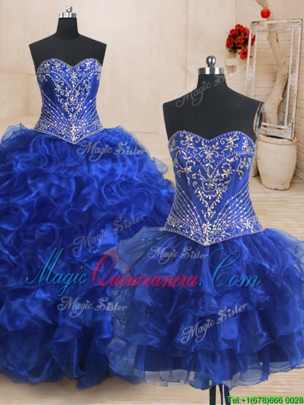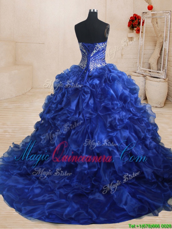 Three Piece Beading and Ruffles Quinceanera Gown Royal Blue Lace Up Sleeveless With Brush Train