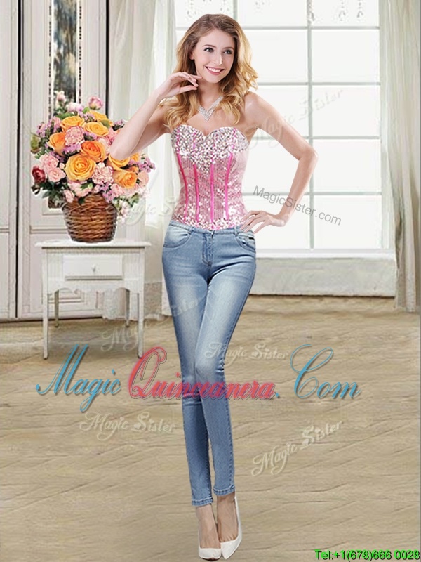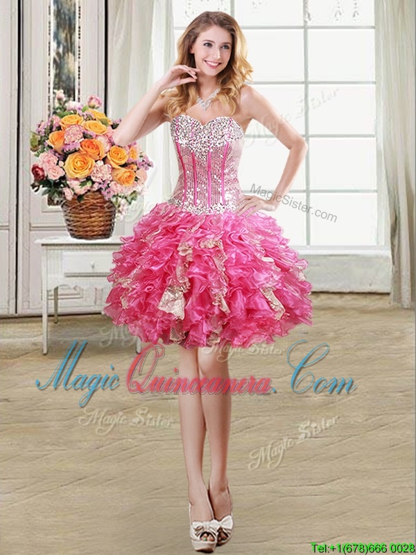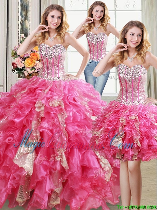 Three Piece Hot Pink Lace Up Sweetheart Beading and Ruffles and Sequins Quinceanera Dress Organza Sleeveless