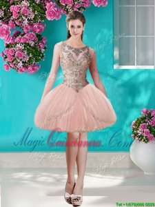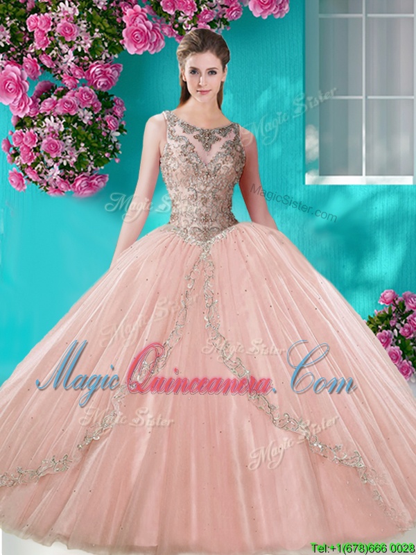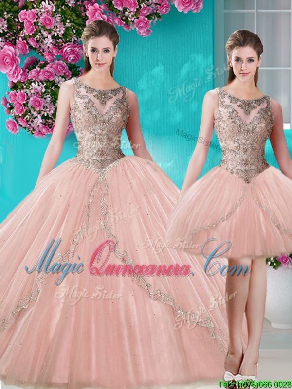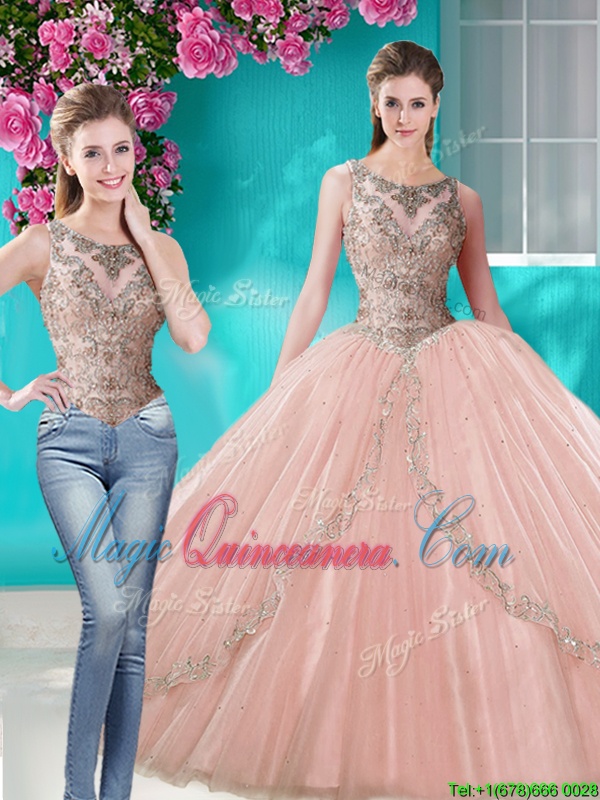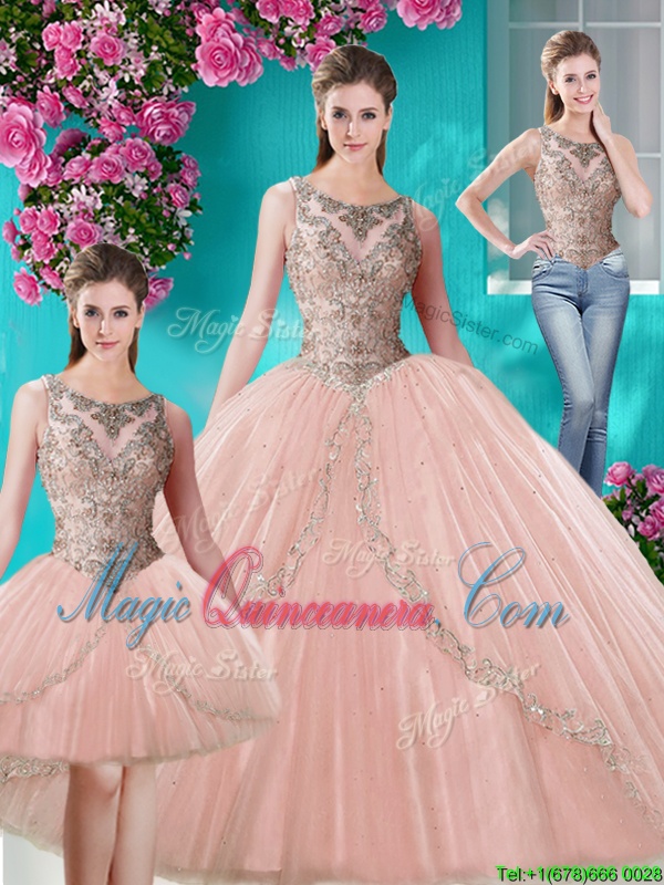 Three Piece Scoop Floor Length Peach 15th Birthday Dress Tulle Sleeveless Beading and Appliques