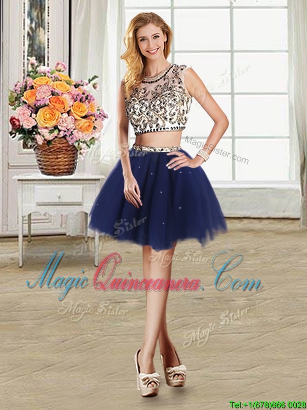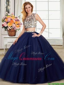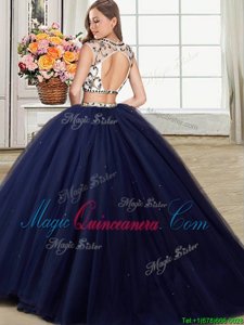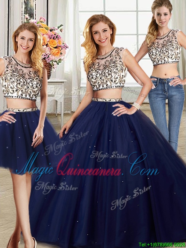 Three Piece Scoop Navy Blue Cap Sleeves With Train Beading Backless Sweet 16 Dress