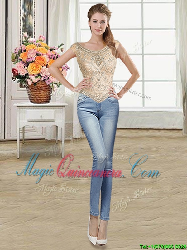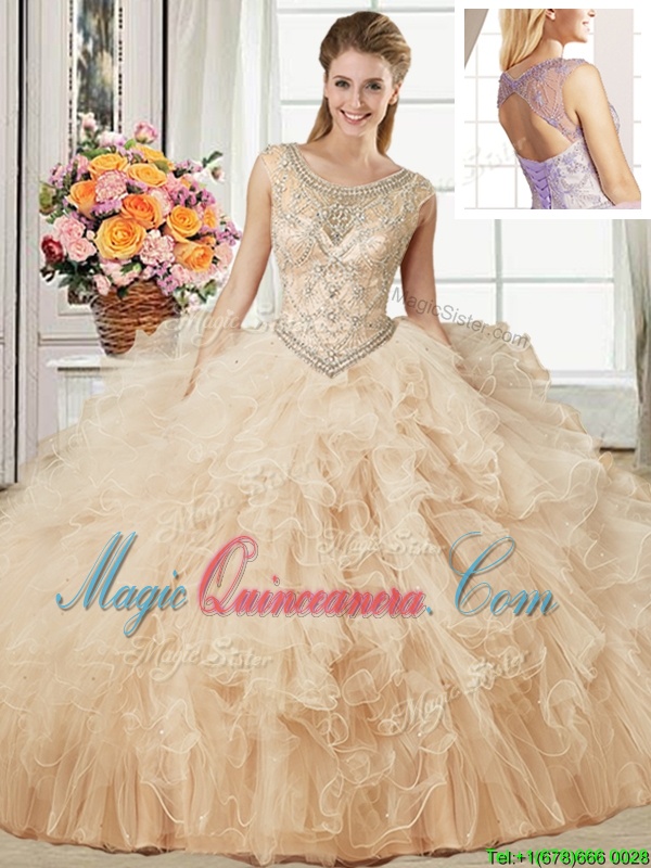 , Three Piece Scoop Sleeveless Lace Up Sweet 16 Quinceanera Dress Champagne Tulle