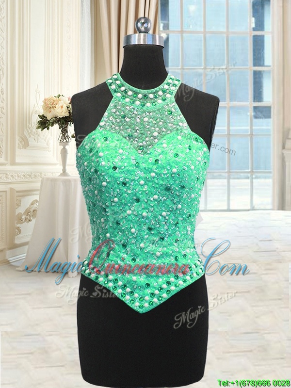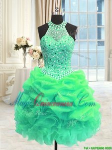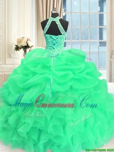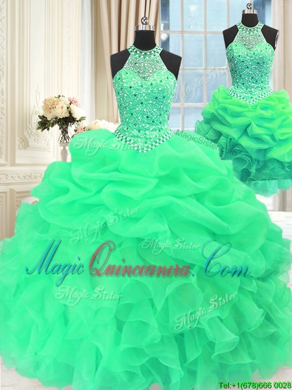 Three Piece Sleeveless Floor Length Beading and Pick Ups Lace Up Ball Gown Prom Dress with Green