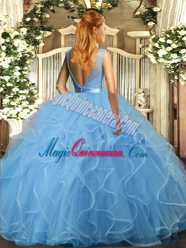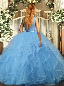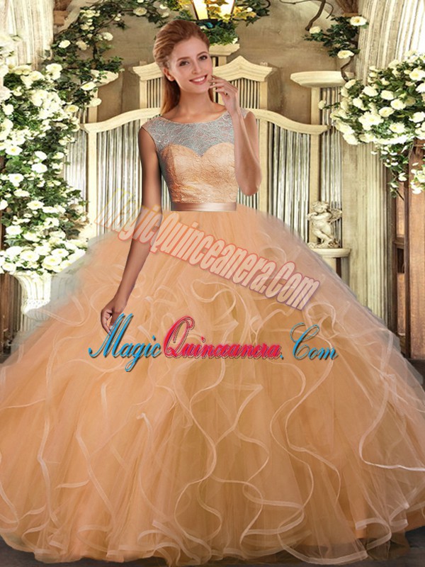 Top Selling Champagne Organza and Tulle Backless Sweet 16 Dress Sleeveless Floor Length Lace and Ruffles and Sashes ribbons