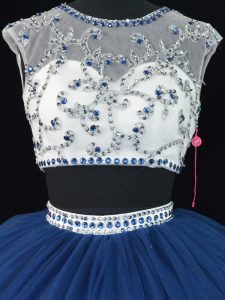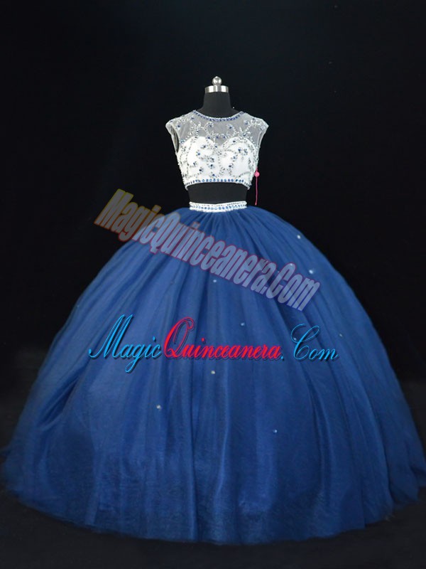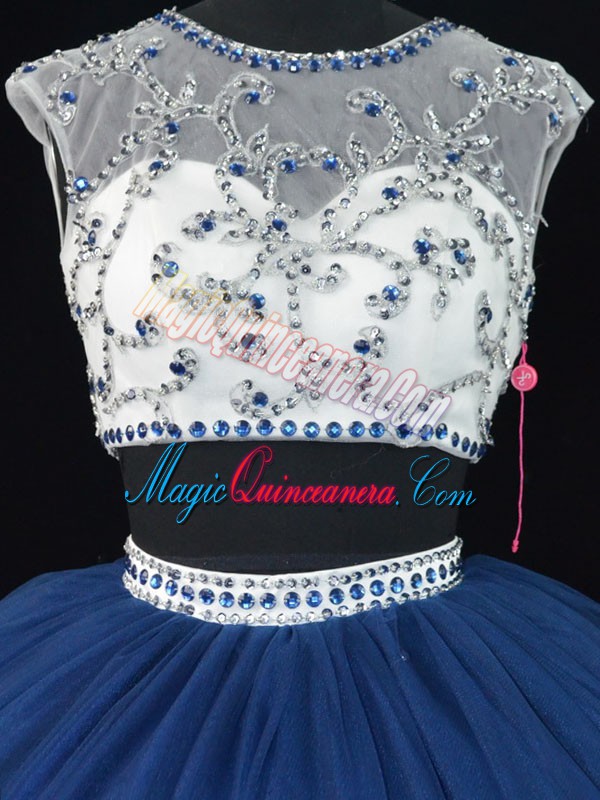 Top Selling Navy Blue Two Pieces Tulle Scoop Sleeveless Beading Floor Length Lace Up 15 Quinceanera Dress