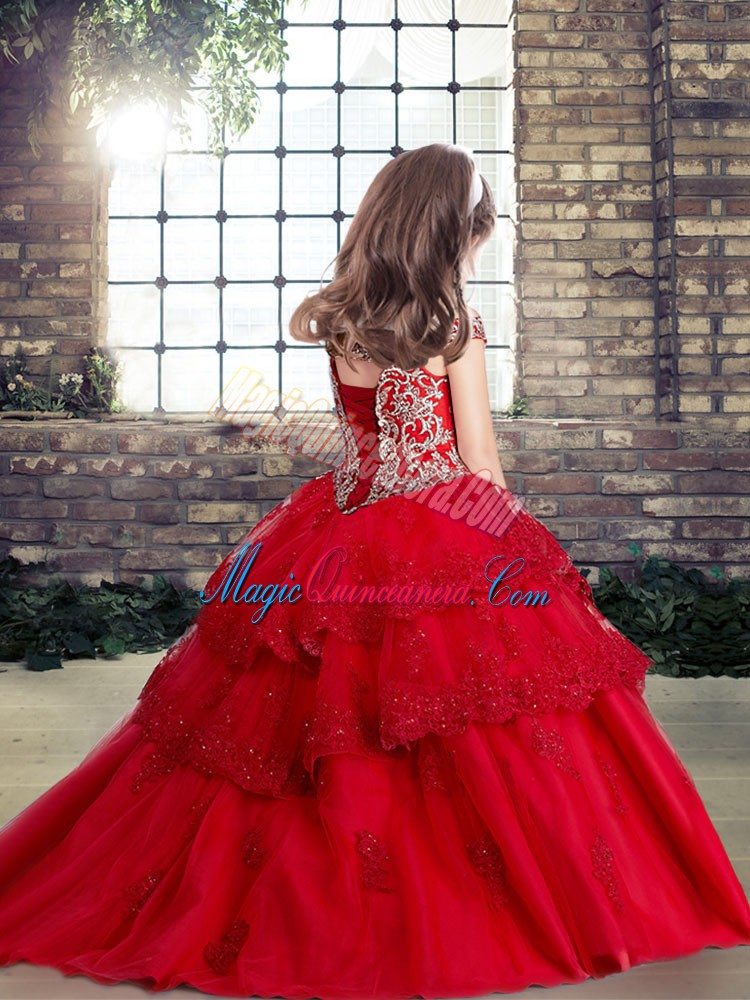 Top Selling Off The Shoulder Sleeveless Kids Formal Wear Floor Length Beading and Appliques Royal Blue