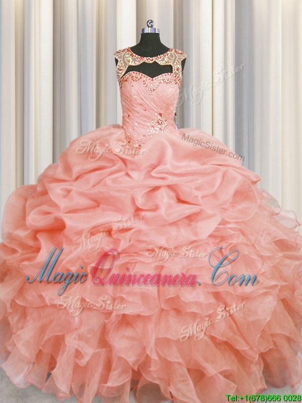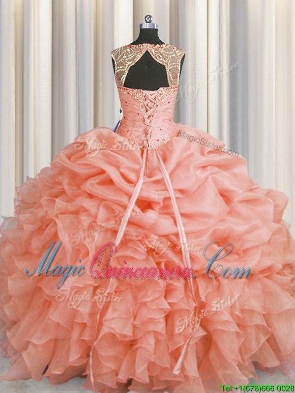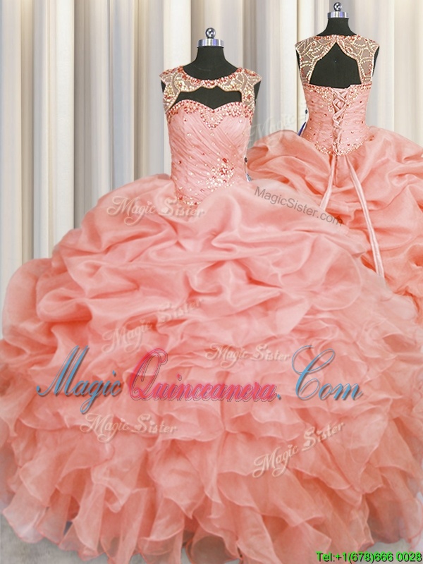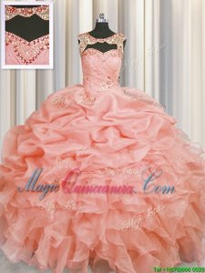 Top Selling Scoop Sleeveless Organza Floor Length Lace Up Quinceanera Gown in Baby Pink for with Beading and Pick Ups