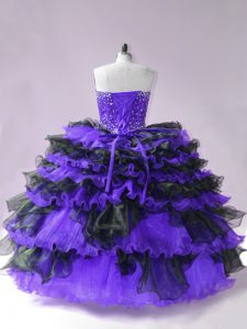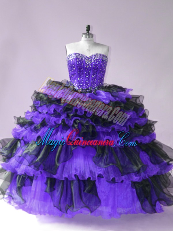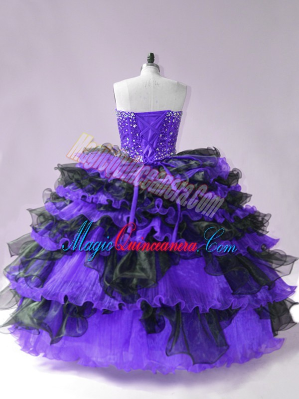 Traditional Black And Purple Sweetheart Lace Up Beading and Ruffled Layers Quinceanera Gown Sleeveless