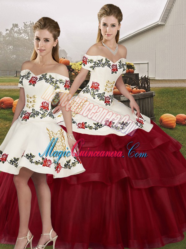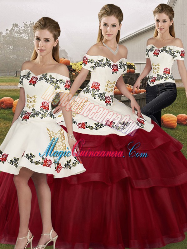 Traditional Brush Train Three Pieces 15 Quinceanera Dress Wine Red Off The Shoulder Tulle Sleeveless Lace Up
