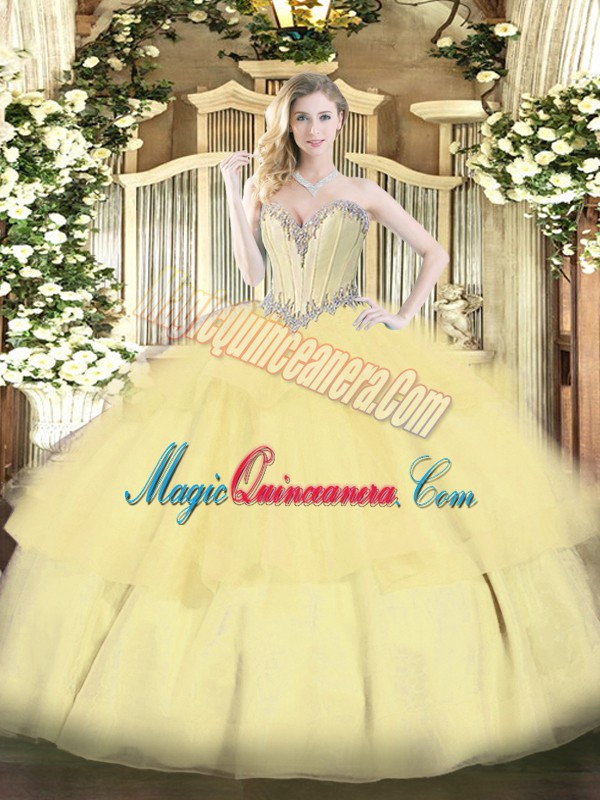 Traditional Gold Quince Ball Gowns Military Ball and Sweet 16 and Quinceanera with Beading and Ruffled Layers Sweetheart Sleeveless Lace Up