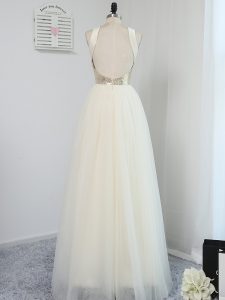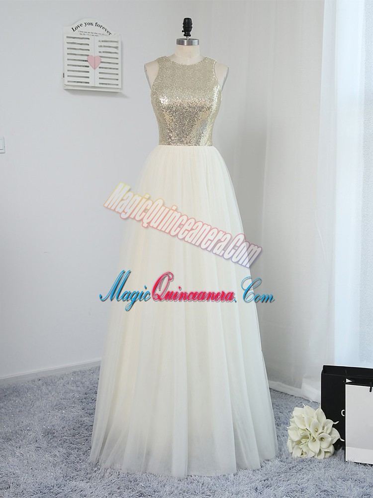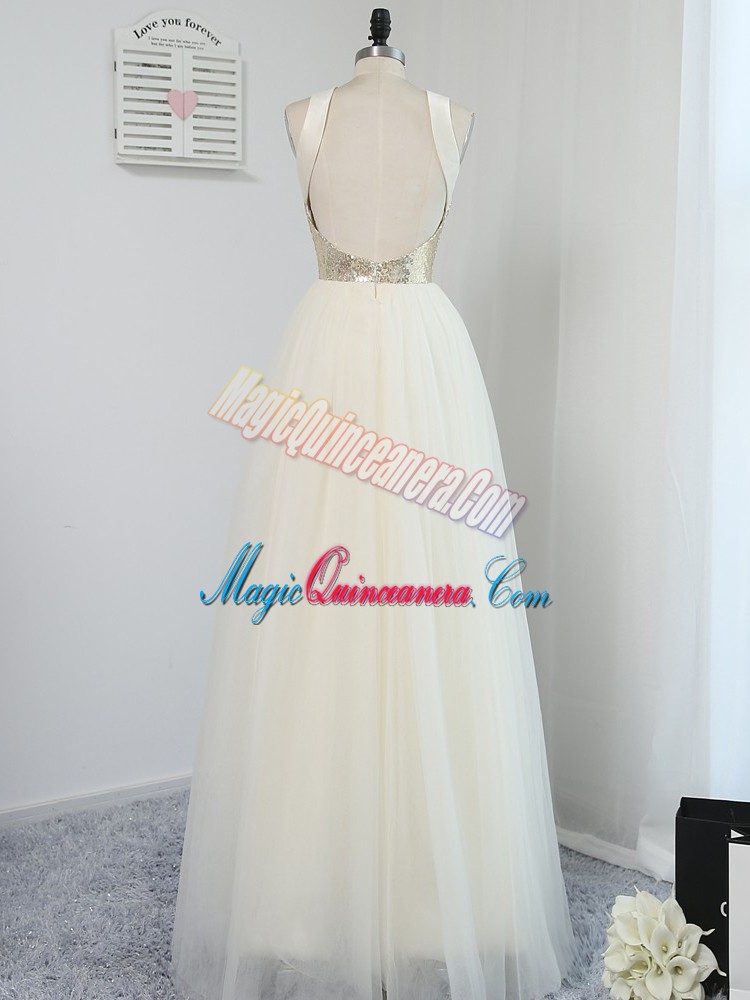 Traditional Light Yellow Scoop Neckline Sequins Quinceanera Dama Dress Sleeveless Backless