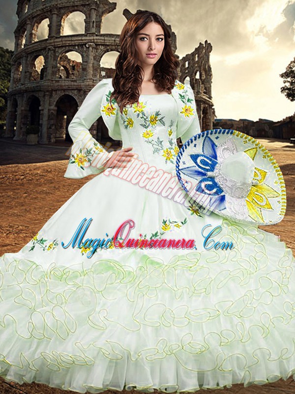Traditional White Organza Lace Up Square Long Sleeves Floor Length Quinceanera Gowns Embroidery and Ruffled Layers