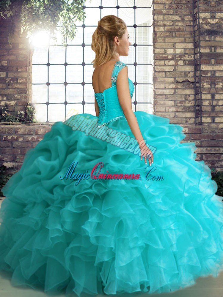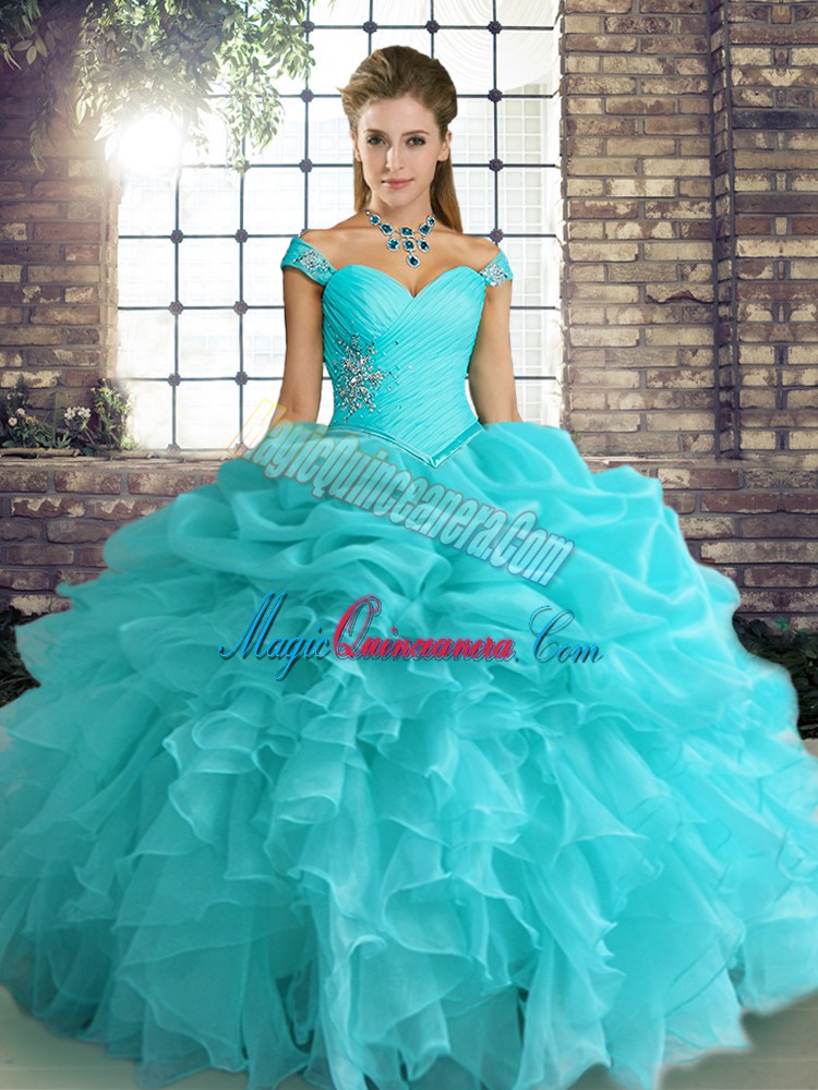 Trendy Aqua Blue Organza Lace Up Off The Shoulder Sleeveless Floor Length 15 Quinceanera Dress Beading and Ruffles and Pick Ups