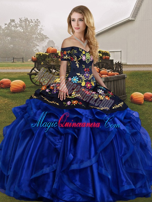 Trendy Ball Gowns Quinceanera Dress Blue And Black Off The Shoulder Organza Sleeveless Floor Length Lace Up